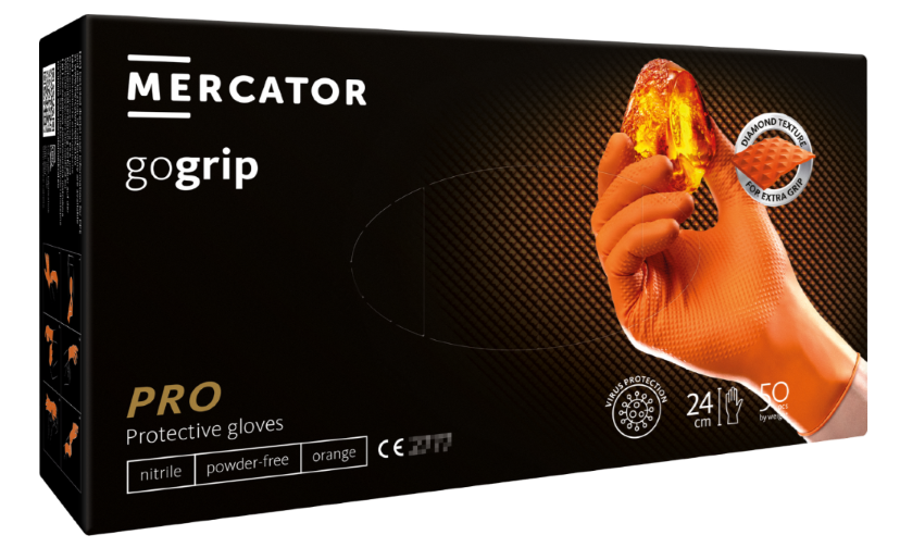 As luvas de nitrilo MERCATOR Go Grip laranja foram desenvolvidas para ambientes exigentes. Com textura 3D diamantada e gramagem de 8.5 gramas, proporcionam aderência firme, resistência química e conforto durante longos períodos de uso. São até 3x mais espessas que as luvas padrão, garantindo maior durabilidade e segurança.