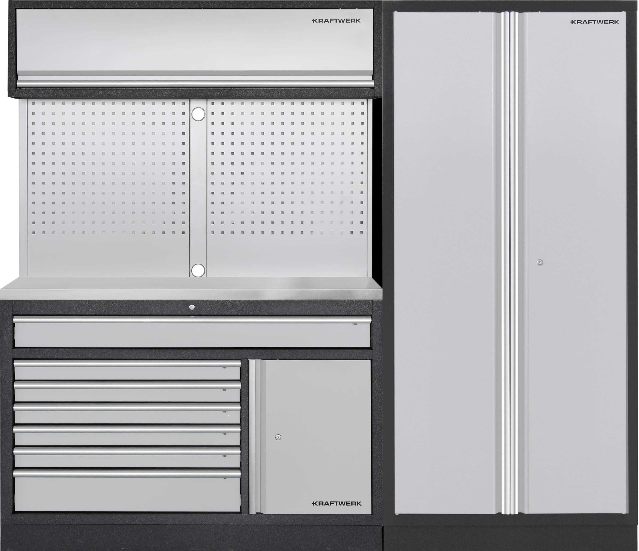 O conjunto de 2 elementos KRAFTWERK MOBILIO oferece uma solução independente e modular para a sua oficina ou garagem. Com sete gavetas com rolamentos de esferas em vários tamanhos, um armário alto com quatro prateleiras, um armário de parede com amortecedor a gás e uma robusta bancada em aço inoxidável 430, esta combinação é perfeitamente pensada. Os tamanhos das gavetas variam entre 1273 mm de largura para a gaveta maior e cinco gavetas com 808 mm de largura, proporcionando compartimentos rasos e profundos para diferentes ferramentas.