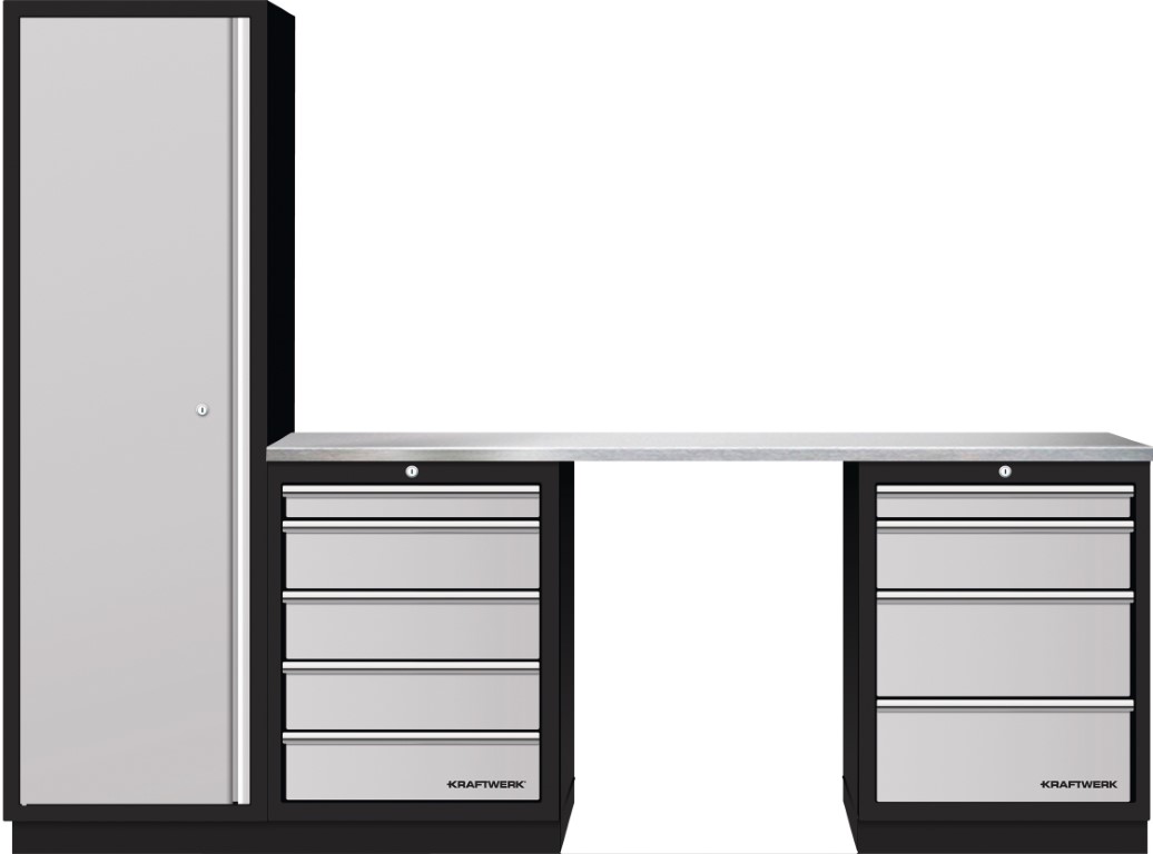 Uma grande vantagem do conjunto de armários KRAFTWERK MOBILIO de 3 unidades é o seu design independente. Não são necessários suportes de parede, o que lhe oferece a máxima flexibilidade na hora de projetar a sua oficina. Se pretende reorganizar ou ampliar a sua oficina, este sistema facilita. Cada módulo pode ser encomendado e expandido individualmente, permitindo personalizar o seu ambiente de trabalho de acordo com as suas necessidades.