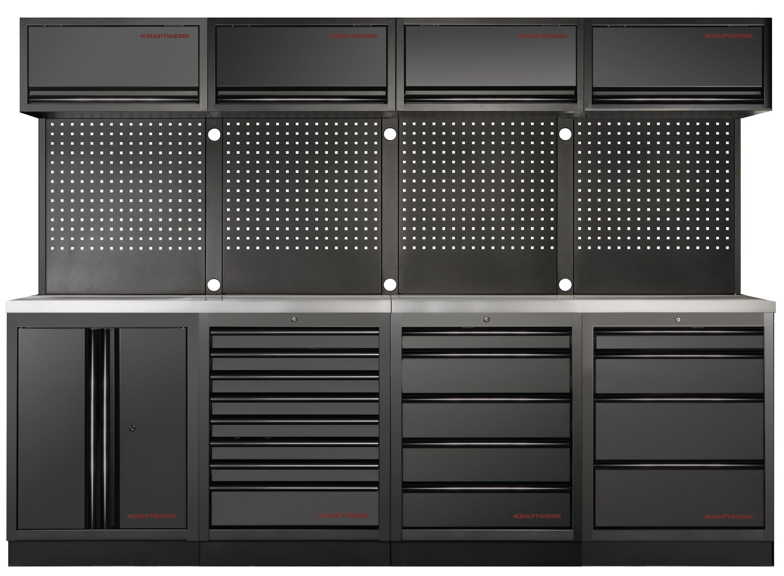 O conjunto de 4 elementos KRAFTWERK MOBILIO BLACK oferece o máximo espaço de armazenamento num design compacto. Com um total de 17 gavetas com rolamentos de esferas, dispostas a diferentes alturas, pode organizar e guardar as suas ferramentas de forma ideal. O armário de gavetas com 8 gavetas é ideal para ferramentas e acessórios mais pequenos, enquanto o armário de gavetas com 5 e o de 4 gavetas oferecem espaço para ferramentas de tamanho médio. O armário inferior com duas portas permite armazenar ferramentas ou materiais de maiores dimensões em segurança. Com as suas generosas dimensões de A 2000 x L 2720 x P 488 mm, oferece um amplo espaço de arrumação.