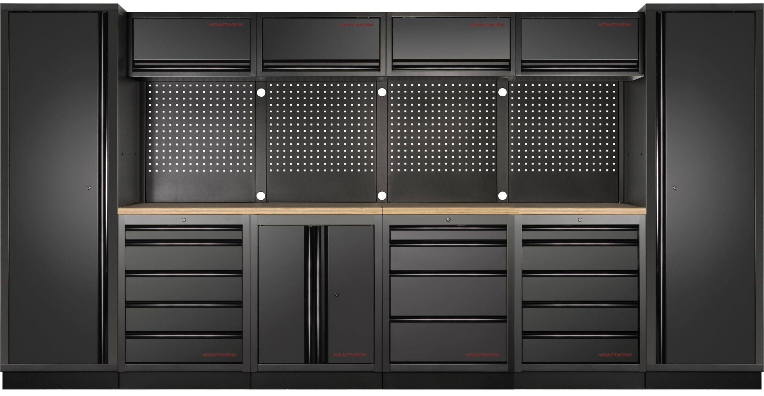O conjunto combinado KRAFTWERK MOBILIO BLACK de 6 elementos apresenta dois armários altos, cada um equipado com três prateleiras. Oferecem um amplo espaço para ferramentas grandes, materiais ou acessórios volumosos. Além disso, os quatro armários superiores com amortecedor a gás permitem um acesso fácil e seguro a artigos frequentemente necessários. Outro elemento é o armário base de 2 portas, que oferece um espaço de armazenamento flexível para ferramentas ou dispositivos que pretende armazenar de forma segura e organizada.