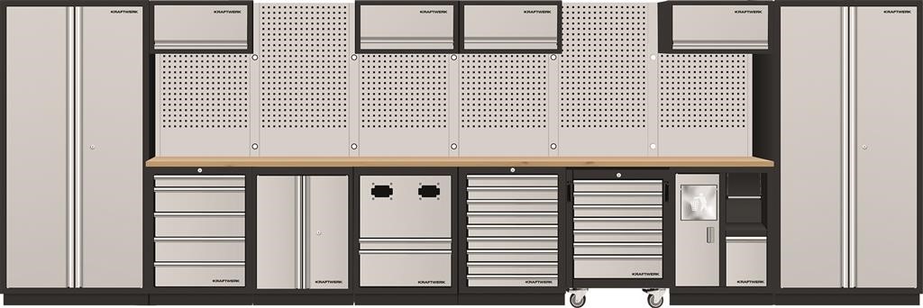 A construção independente da combinação KRAFTWERK MOBILIO 8 elementos, oferece a máxima flexibilidade de posicionamento na sua oficina. Como não são necessários acessórios, pode reorganizar o sistema conforme desejar. Além disso, cada módulo está disponível individualmente, permitindo-lhe expandir a sua oficina conforme necessário. Esta capacidade de expansão torna o sistema à prova de futuro e adaptável às suas crescentes necessidades. Com as suas generosas dimensões de A 2000 x L 2955 x P 488 mm, o sistema oferece um amplo espaço.